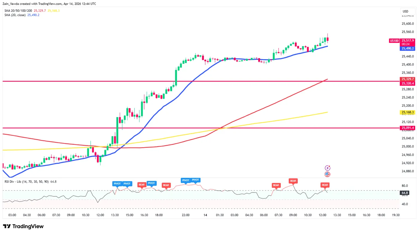 Nasdaq 100 M15 Chart, April 14, 2026