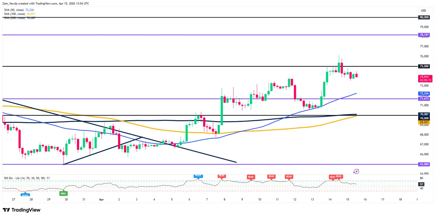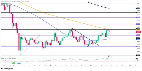 Bitcoin (BTC/USD) Daily Chart, April 15, 2026