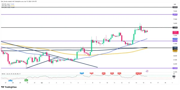 However, price action has stalled over the last 24 hours just shy of the 75000 mark. We are seeing a series of “BEAR” labels on the RSI, which is currently at 57.