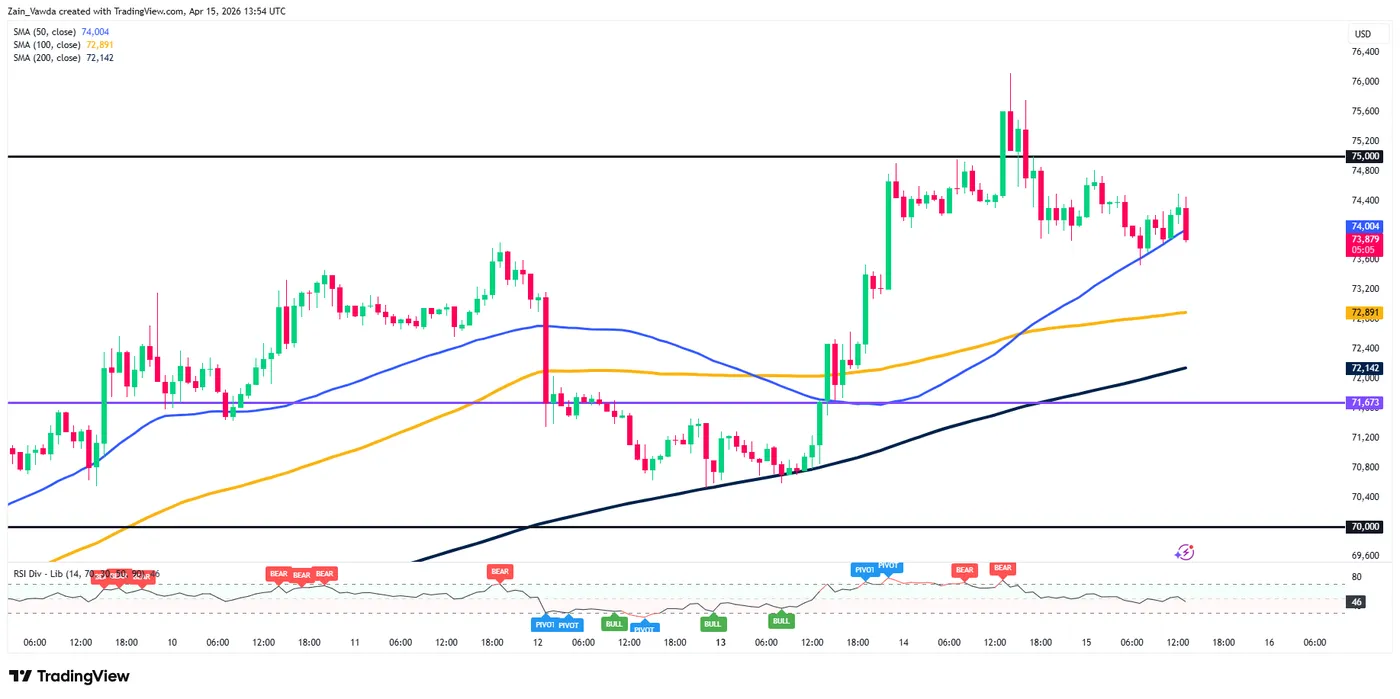 The hourly chart reveals the intraday sensitivity of Bitcoin as it trades within a narrowing range. Currently at 73918, the immediate direction will likely be determined by how price reacts to the ascending 50-day MA (blue) on this timeframe.