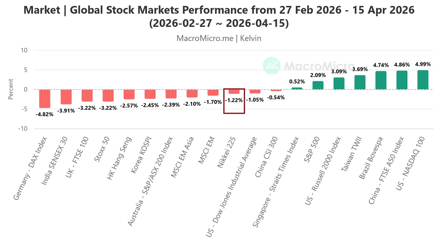 Fig. 1: Global major benchmark stock indices performances from 27 Feb 2026 to 15 Apr 2026 (Source: MacroMicro).