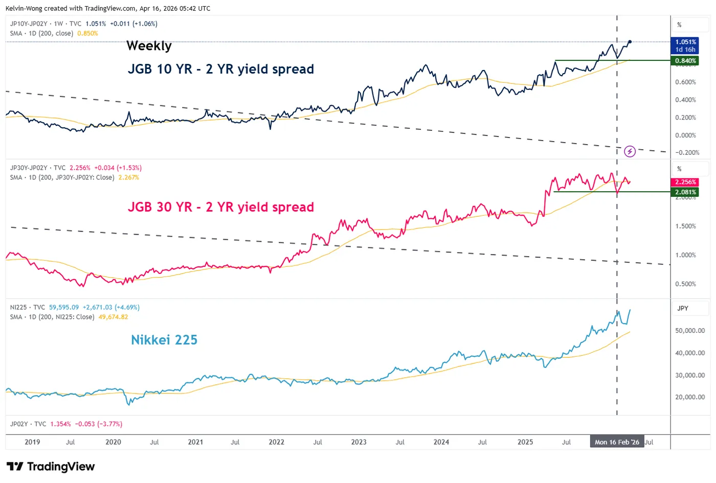 Fig. 2: JGB yield curves major trends with Nikkei 225 as of 16 Apr 2026 (Source: TradingView).