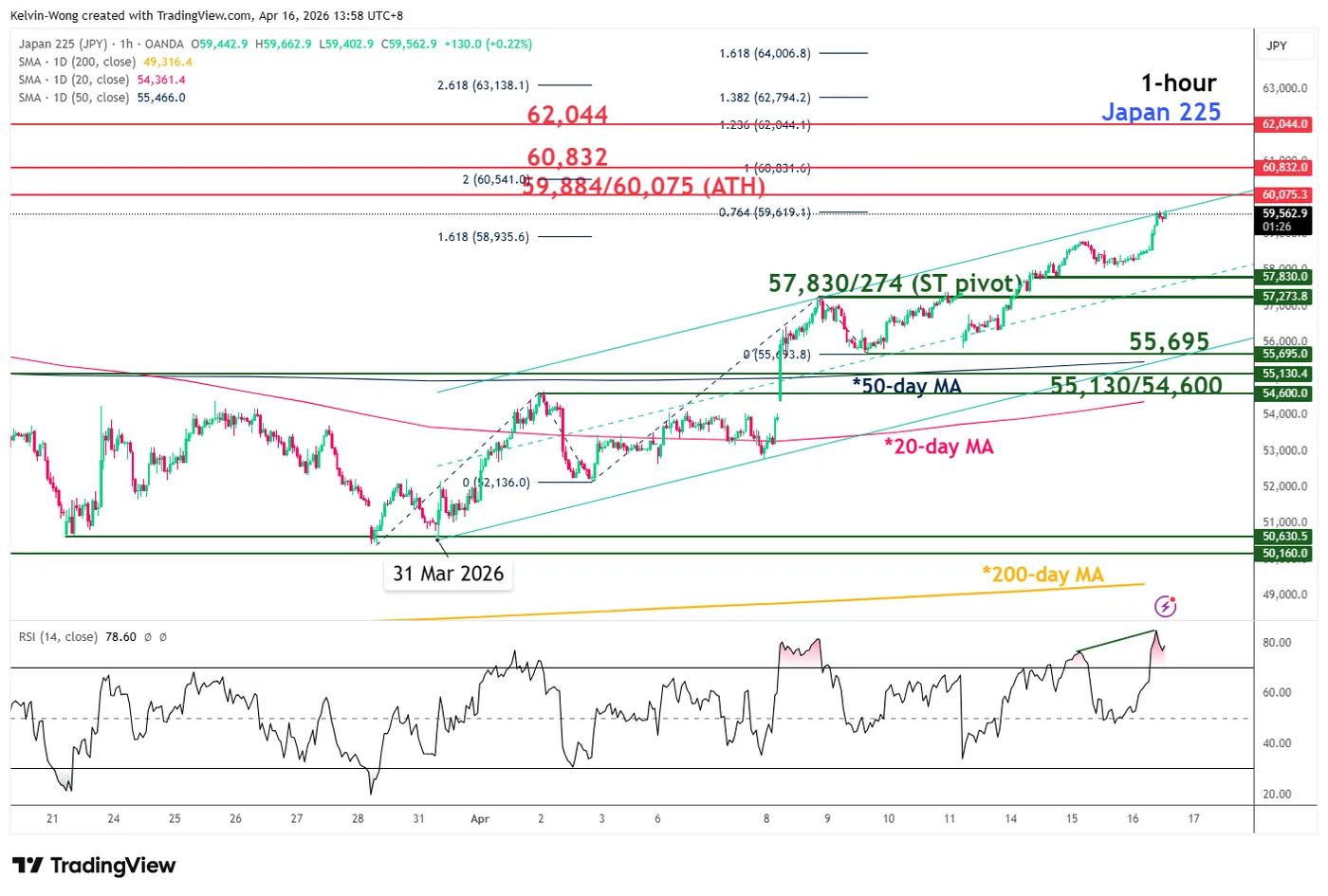 The ongoing 18% rally seen from the 31 March 2026 low on the Japan 225 CFD index (a proxy of the Nikkei 225 futures) is now fast approaching an intermediate resistance of 59,890/60,075 (also the current all-time high printed on 26 February 2026).