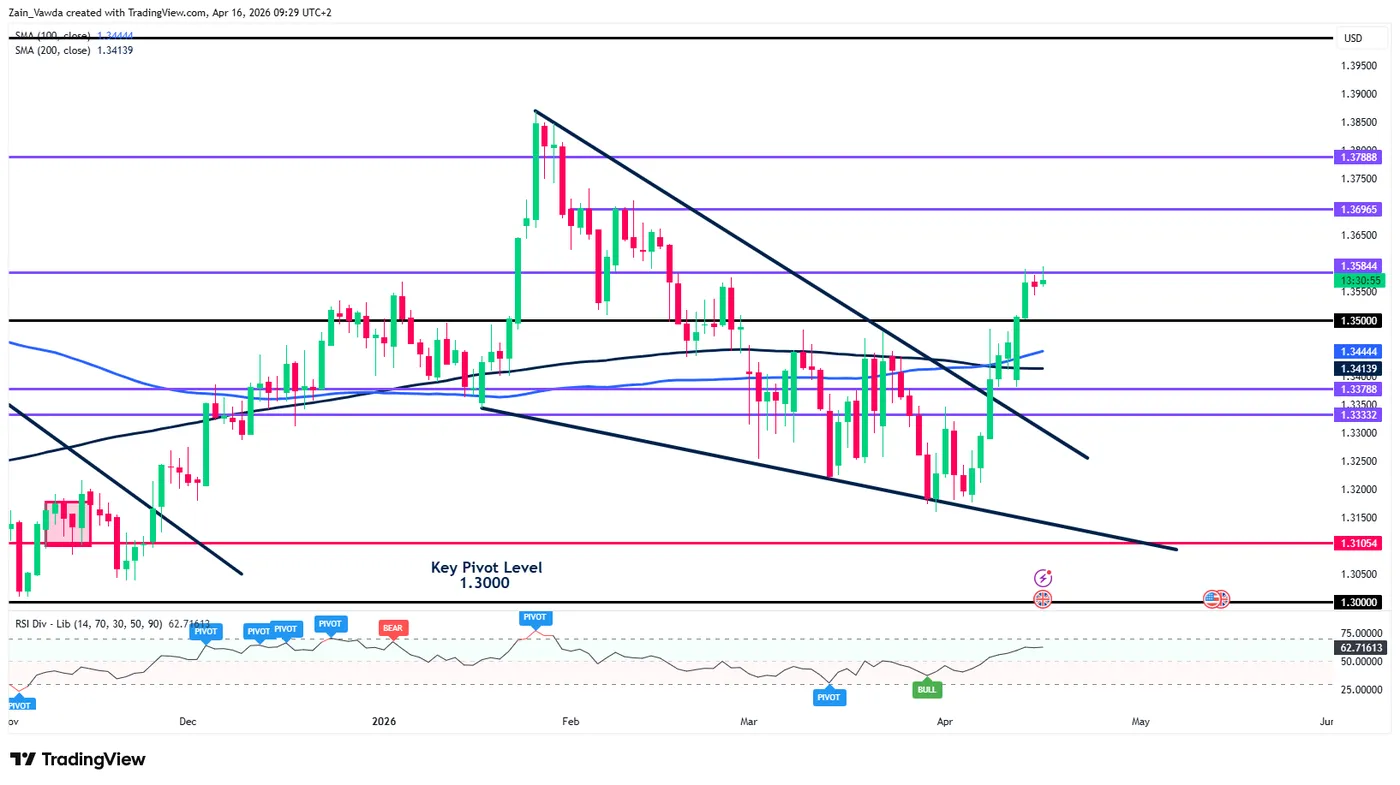 Moving down to the H4 chart, the impulsive nature of the current rally is clear. The pair surged through the 1.3500 psychological level, which had previously acted as a formidable ceiling.