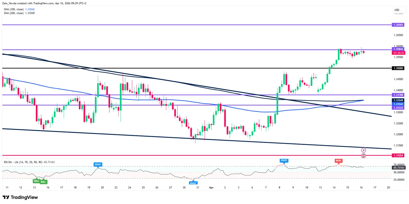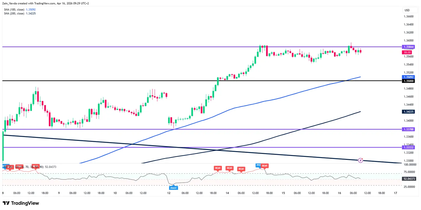 The hourly chart shows Cable currently consolidating in a tight range between 1.3560 and 1.3585. The 100-MA (blue) on this timeframe is providing immediate dynamic support at 1.3509.