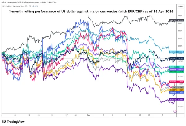 Fig. 1: 1-month rolling performances of the US dollar against major currencies as of 16 Apr 2026 (Source: TradingView).