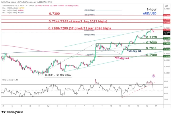 The AUD/USD has jumped by 230 pips (+3.3%) from the 8 April 2026 low to print an intraday high of 0.7198 on Thursday, 16 April 2026 at this time of writing, just a whisker above its prior 11 March 2026 high of 0.7188.
