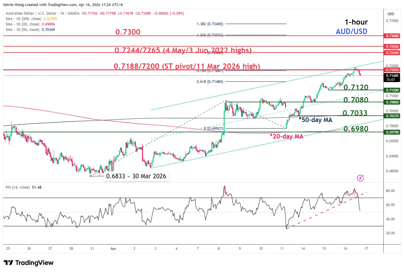 • Today’s current intraday high of 0.7198 has hit the upper boundary of the minor ascending channel in place since the 2 April 2026 low.