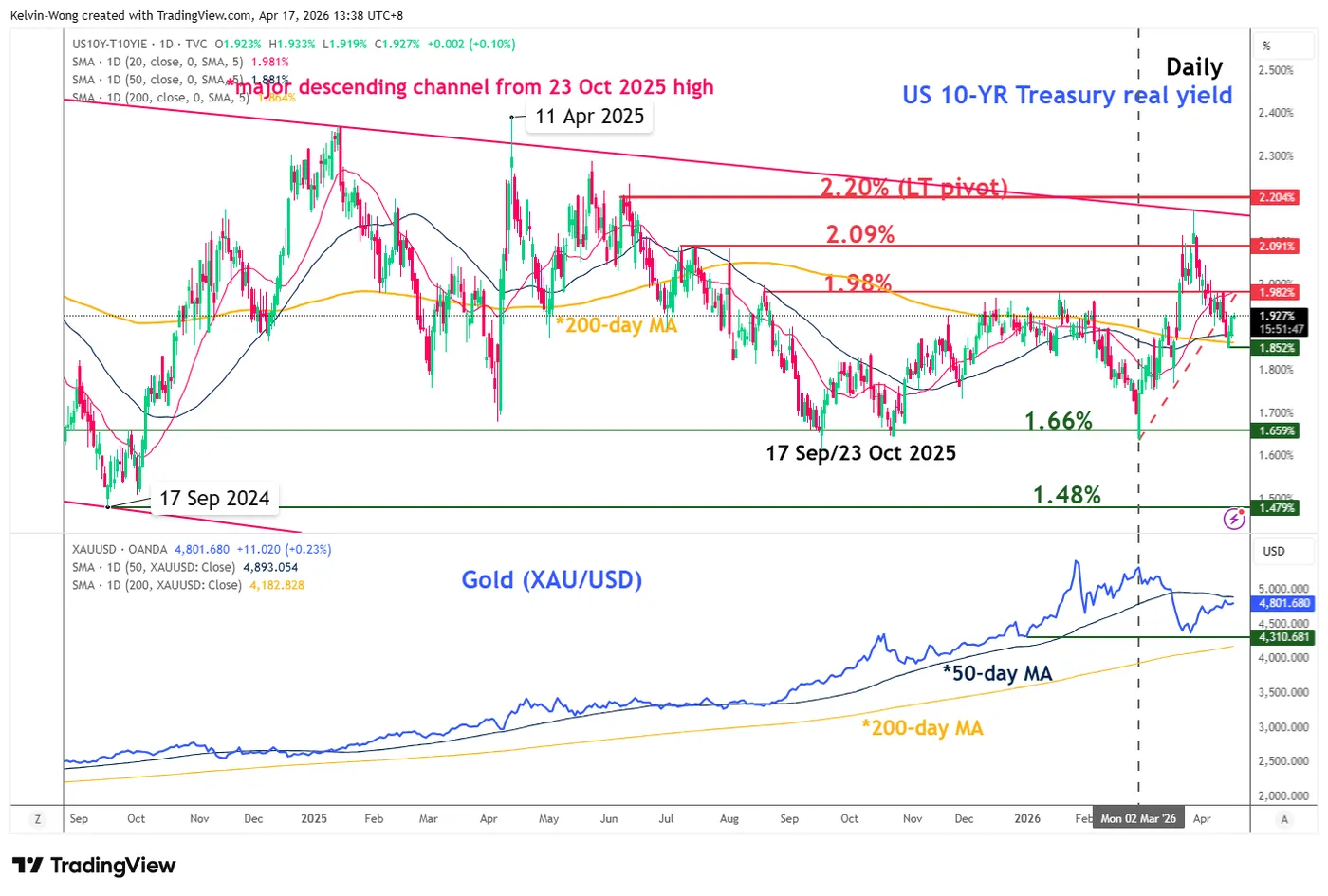Right now, a break below its recent 15 April 2026 low of 1.85% (also the 200-day moving average) is likely to see further weakness in the 10-year US Treasury real yield to retest its medium-term range support at 1.66%, in turn, benefiting gold.