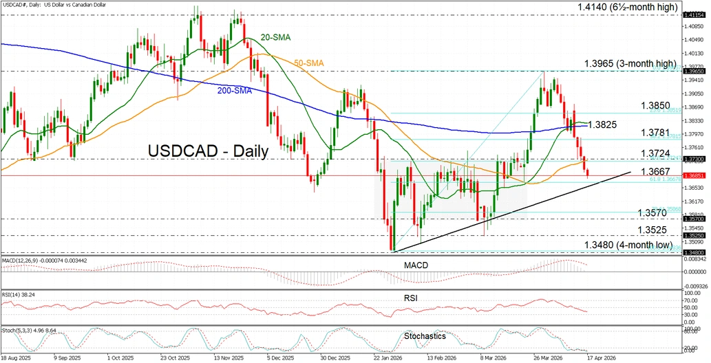 USD/CAD is extending its corrective decline from the year‑to‑date high of 1.3965 reached in late March, sliding for a fifth consecutive session and marking nine down days in the past ten. The move has dragged spot prices to more than three‑week lows near 1.3680, last seen on March 23. Elevated oil prices continue to support the commodity‑linked Canadian dollar, keeping pressure on the pair, although a modest USD recovery could help limit further downside amid ongoing US‑Iran talks.
