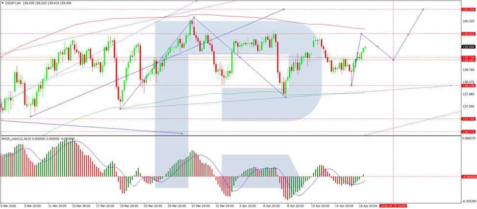 On the H4 USD/JPY chart, the market is forming a consolidation range around the 159.00 level, currently extending up to 159.25. A move higher towards 159.90 (testing from below) is likely, followed by a possible decline back to the 159.00 level. Technically, this scenario is confirmed by the MACD indicator, whose signal line is below the zero level and pointing firmly upwards.