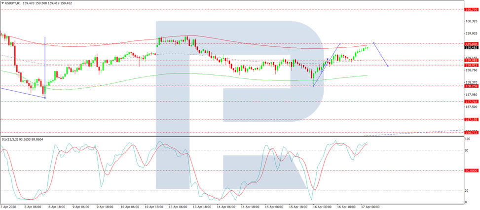On the H1 chart, the market is forming the structure of the next upward wave towards the 159.60 level. A wave extension to 159.90 is possible. Subsequently, a decline to at least 159.00 is likely. Technically, this scenario is confirmed by the Stochastic oscillator, with its signal line above the 80 level and pointing firmly upwards.