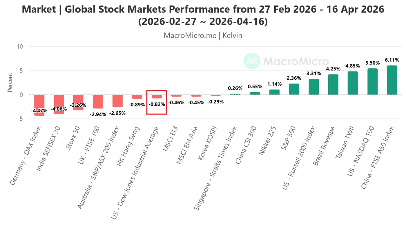 Fig. 1: Global benchmark stock indices performances from 27 Feb 2026 to 16 Apr 2026 (Source: MacroMicro).