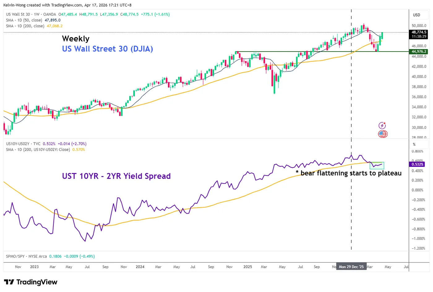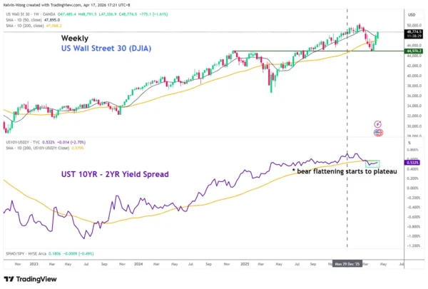 The underperformance of the Dow Jones Industrial Average has been underpinned by bear flattening of the US Treasury yield curve (10-year minus 2-year), where the yield spread dropped by 11 basis points (bps) to hit an eight-month low of 0.48% on the week of 16 March 2026; such a shift typically signals tighter financial conditions, which can weigh on economic growth and pressure bank profitability.