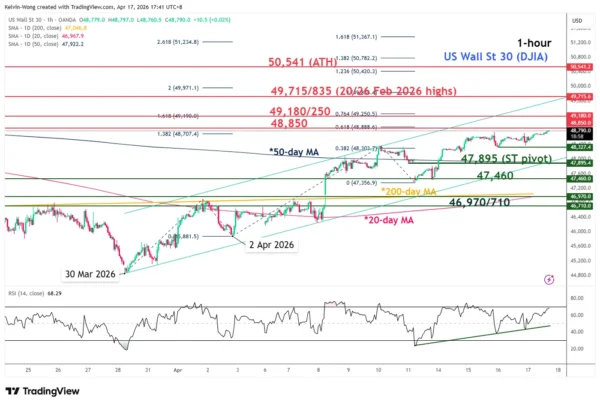 - Elliot Wave Theory suggests the recent rally from the 2 April 2026 low of 45,882 is likely considered as a minor bullish impulsive wave three structure with its potential terminal zone at 49,715/49,835 (1.00 Fibonacci extension from the 2 April 2026 low and the upper boundary of the minor ascending channel).