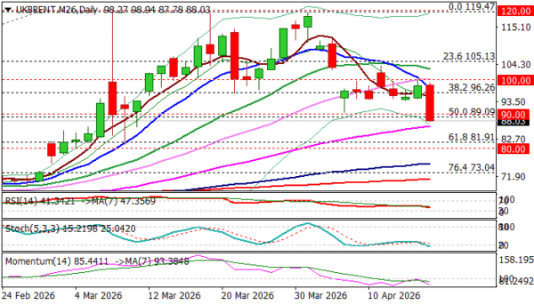 Bears also broke psychological $90 level and dented important Fibo support at $89.09 (50% retracement of $58.70/$119.47 rally) with weekly close below these levels to confirm bearish signal.