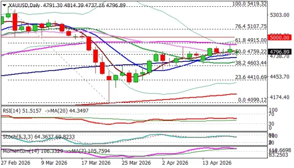 Near-term action is likely to remain in sideways mode while range boundaries ($4759 / $4891 -55DMA) hold, with conflicting indicators on daily chart (MAs in predominantly bullish configuration, countered by weaker momentum studies / price weighed by daily cloud).