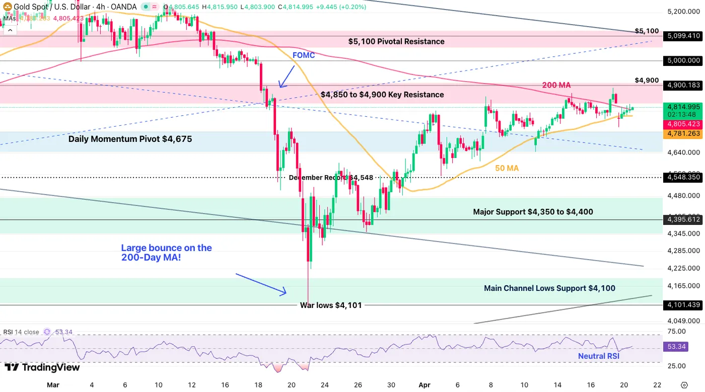 Gold (XAU/USD) 4H Chart, April 20, 2026 – Source: TradingView