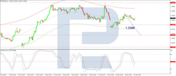 On the H1 chart, the market has formed a compact consolidation range around the 1.3515 level. A downside breakout could lead to a move towards 1.3444, followed by a possible rise to 1.3495. Technically, this scenario is confirmed by the Stochastic oscillator, with its signal line below the 20 level and pointing firmly downwards.