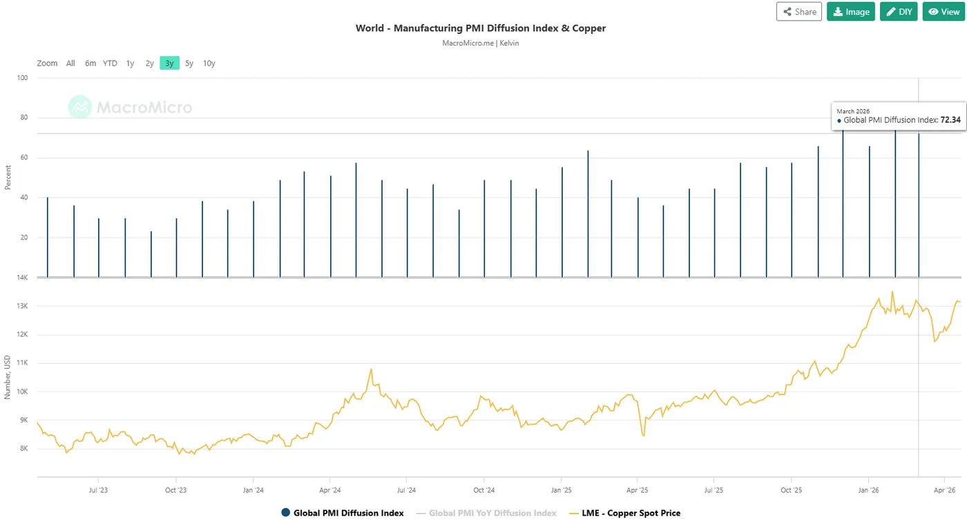 • Fundamentals are still supportive: Global manufacturing activity remains in expansion (PMI diffusion ~72%), providing a solid demand backdrop for copper, with upcoming flash PMI data as a key near-term catalyst.