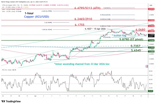 • The price action of copper (XCU/USD) has continued oscillating within a minor ascending channel in place since the 23 March 2026 low and still has room to move towards the upper boundary of the channel at around 6.1755/6.2910.