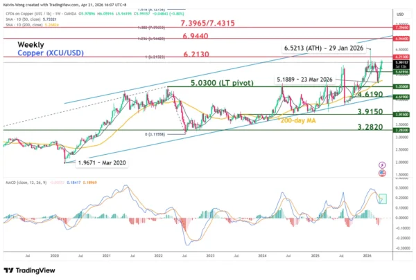 On Thursday, 23 April 2026, S&P Global will release flash PMI data for a slew of developed economies (Australia, Japan, the Eurozone, the UK, and the US). Therefore, a continuation of the expansion pace seen in these economies’ manufacturing PMIs is likely to maintain the ongoing short-term bullish trend of copper (XCU/USD).