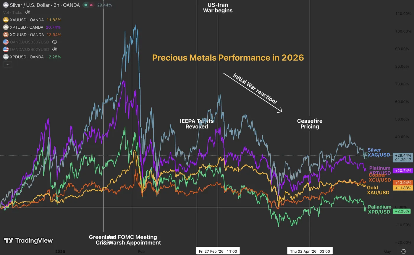 Metals performance since end 2025 – Source: TradingView. April 23, 2026