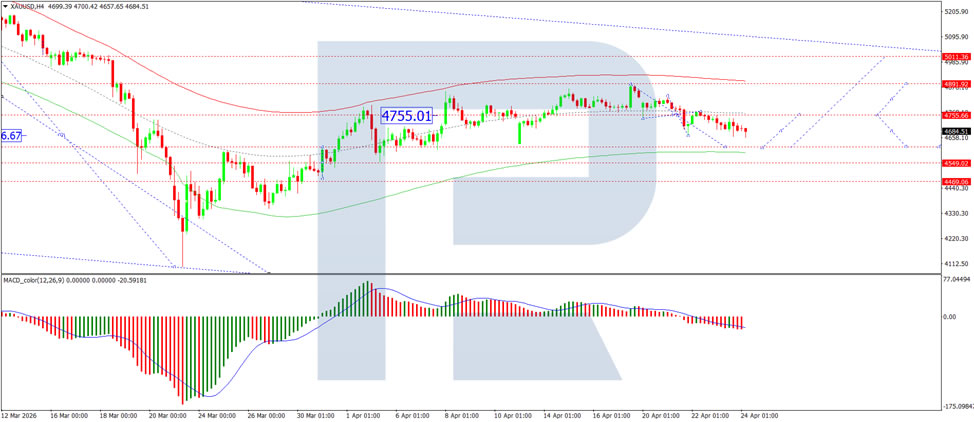 On the H4 XAU/USD chart, gold is trading within a consolidation range around the 4,685 USD level. An upside breakout could push prices towards 4,755 USD, while a downside break could lead to a decline towards 4,616 USD. The MACD indicator confirms the current downside momentum, with its signal line below the centre line and pointing firmly downwards.