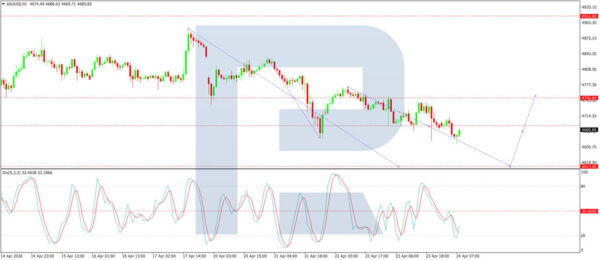 On the H1 chart, gold has broken below the 4,693 USD level and continues to move lower towards 4,616 USD. A corrective rebound towards 4,750 USD (testing from below) is likely, followed by a possible decline to 4,690 USD. The Stochastic oscillator supports this scenario, with its signal line below 50 and pointing firmly downwards towards 20.