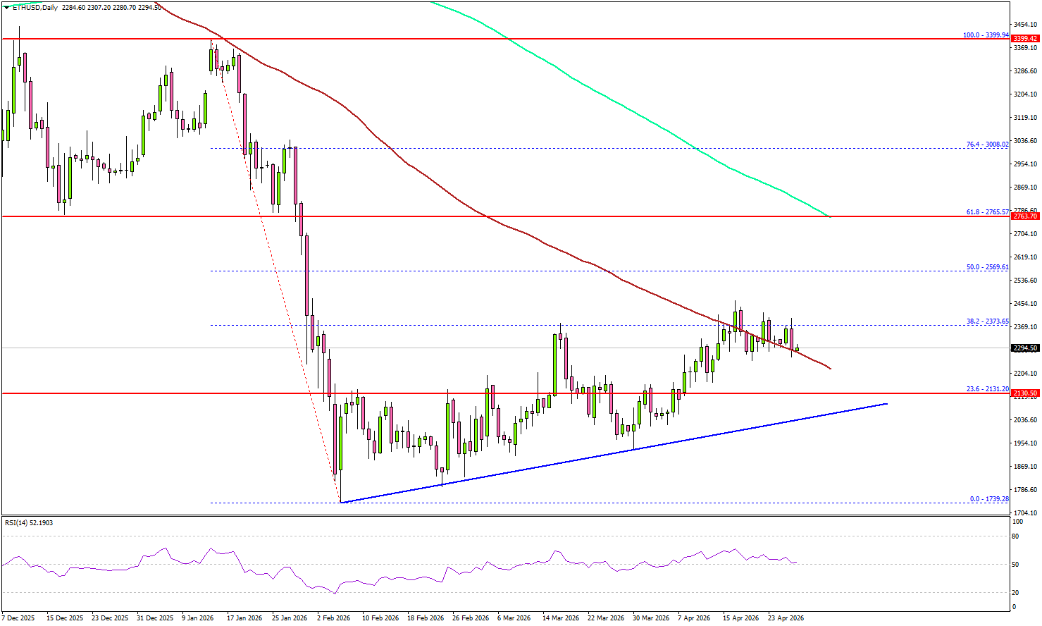 On the downside, the bulls might be active near $2,250 and $2,220. The main support is now forming near $2,100. There is also a bullish trend line forming with support at $2,100, below which the price could slide toward $1,950. Any more losses might call for a move toward $1,880.