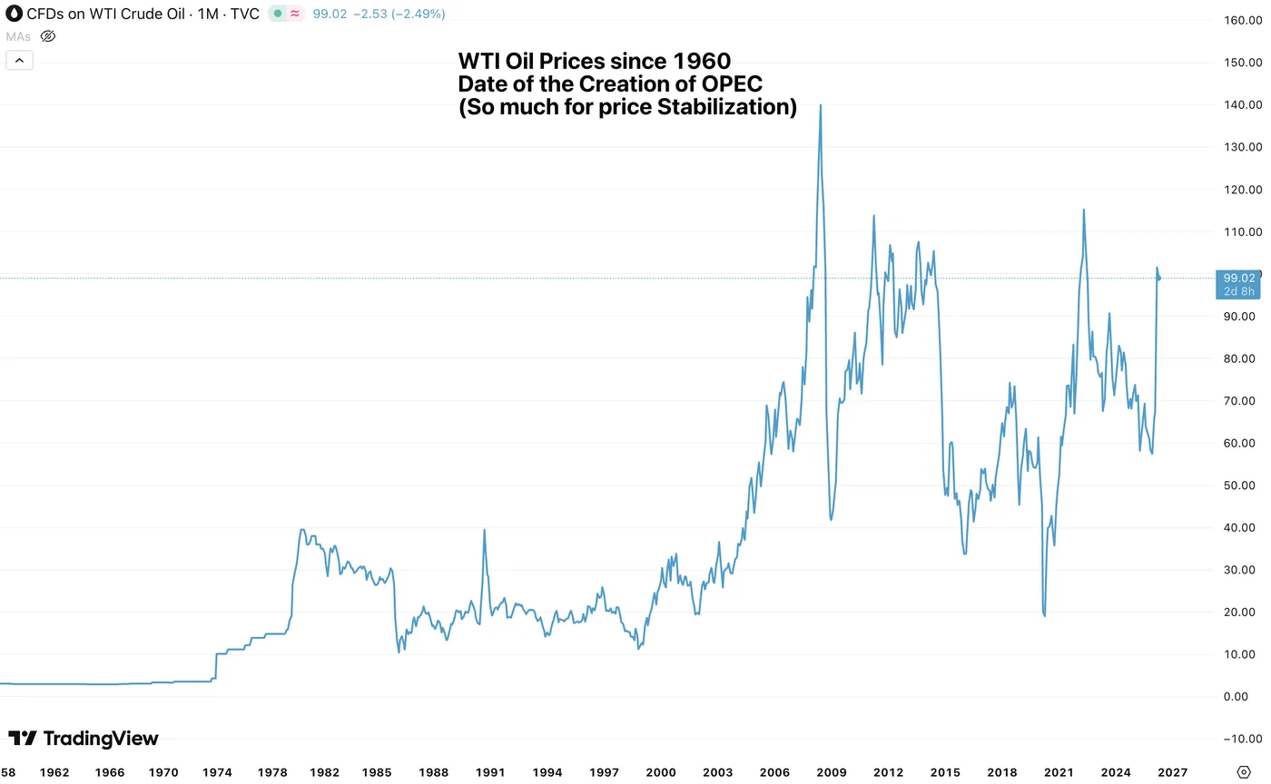WTI Crude since 1960, the formation of OPEC – Source: TradingView. April 28, 2026