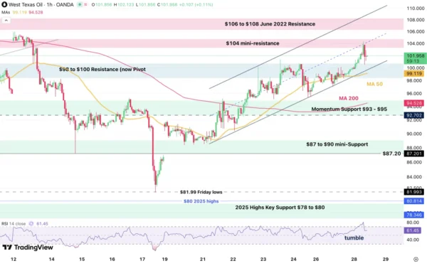 This hints at higher odds of a downside break, with confirmation below the 50-Hour MA ($99.13).
