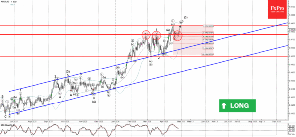 Given the overriding daily uptrend, AUDCAD currency pair can be expected to rise to the next resistance level 0.9870 (top of the previous impulse wave i).