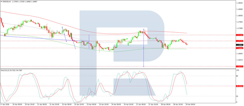 On the H1 chart, EUR/USD is developing a move lower towards 1.1685. A corrective rebound to 1.1705 may follow, before a further decline towards 1.1650 and potentially 1.1616. Technically, this scenario is confirmed by the Stochastic oscillator, with its signal line below 80 and pointing firmly downwards towards 20.