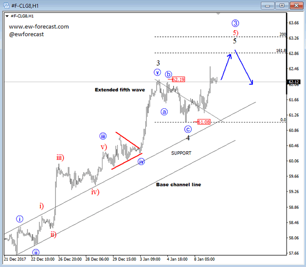 Commodity remains on bullish side, which was confirmed by a new break to the highs on crude that came out of a fourth wave so fifth wave rise may continue towards our Fib levels placed near 63.00.