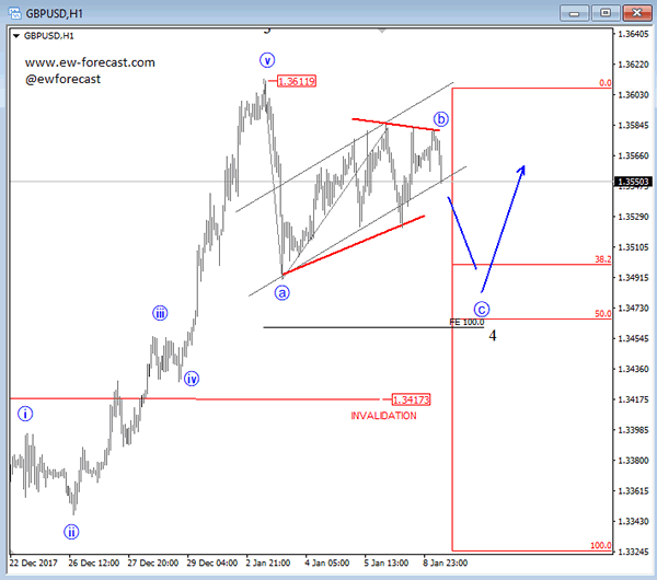 Cable is seen in a fourth wave which will ideally retest levels below 1.35 before it turns up again for a new bullish run into higher degree wave 5. A five wave rally and breach above 1.3612 level would suggest wave 5 to be in progress.