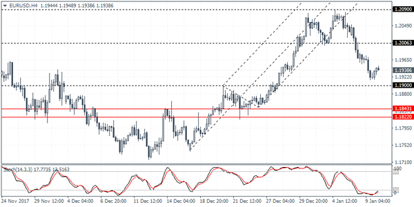 EURUSD (1.1938):The EURUSD extended declines for the third consecutive day. Price action posted a reversal after falling to a two week low. However, we expect the declines to continue towards the 1.1900 handle as mentioned previously. To the upside, the gains are limited to the 1.2000 handle where resistance could be formed following a brief spell of this level serving as support.