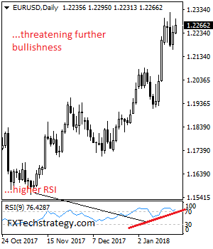 EURUSD – The pair continues to retain its upside pressure as it looks to target the 1.2322 level. On the upside, resistance comes in at 1.2300 level with a cut through here opening the door for more upside towards the 1.2350 level. Further up, resistance lies at the 1.2400 level where a break will expose the 1.2450 level. Conversely, support lies at the 1.2200 level where a violation will aim at the 1.2150 level. A break of here will aim at the 1.2100 level. Below here will open the door for more weakness towards the 1.2050. Its daily RSI is bullish and pointing higher. All in all, EURUSD faces further upside move on bullish offensive