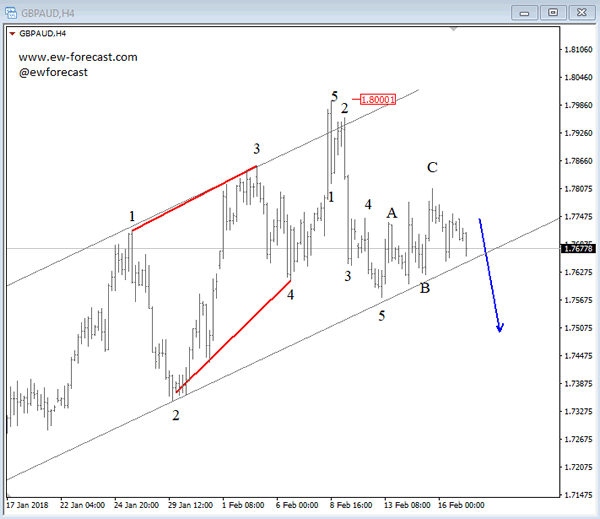 GBPAUD made a nice five-legged drop from 1.8000 level, which can be regarded as the first sign for a locked in top, and for a minimum three-wave bearish reversal to be underway. After the five wave drop, we have seen a temporary pullback as in an A-B-C matter that looks now completed, and points towards new lows. On that note a breach below the lower channel line would signal a bearish continuation.