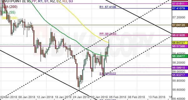 The pair has formed a new medium-term channel, and the price is gradually moving north to test the upper boundary in combination with the monthly pivot point at the 56.64 mark.