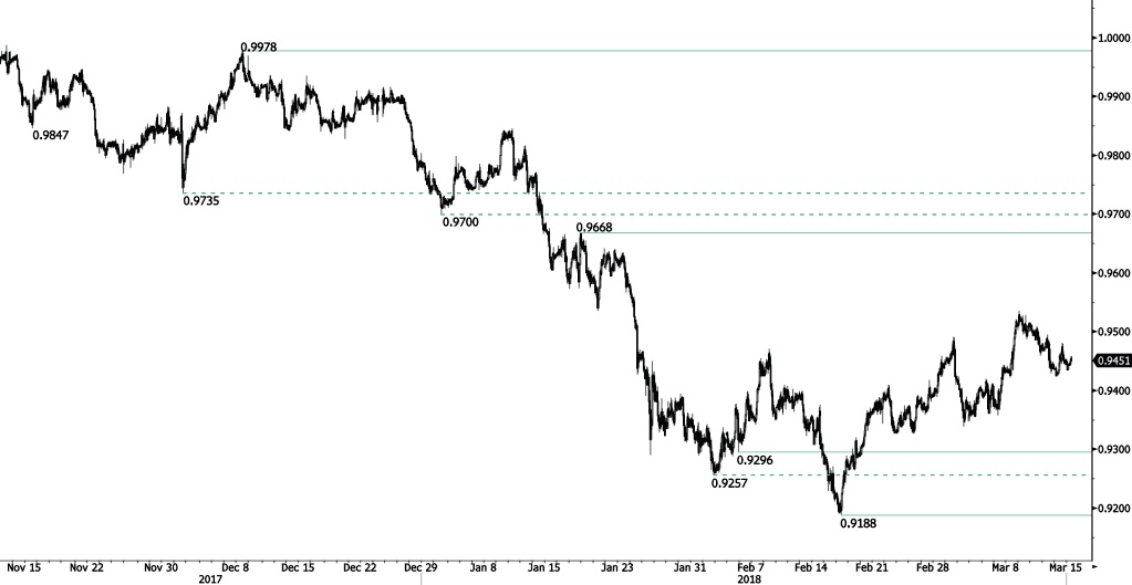 USD/CHF is trading sideway following recent hike at 0.9480. The pair currently trades between hourly support and resistance at 0.9296 (05/02/2018 low) and 0.9668 (17/01/2018 high). Expected to show short-term decrease.