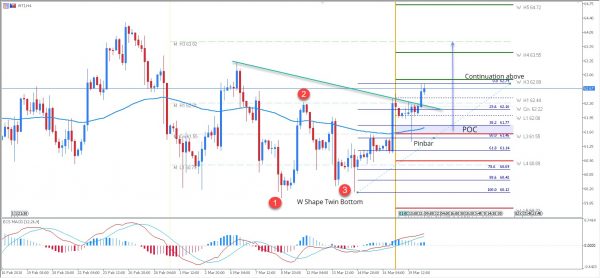 The WTI has formed a W-Shape Twin Bottom suggesting bullish pressure. The price has made a bullish pinbar straight off W L3 support which creates a POC zone. In the case of a retracement, the POC should provide another bounce. If we see a strong 1h momentum aboveW H3 (or 4h close above), next target is W H4/ M H3 63.55-82. As long as the price holds above W L4/ M L1 60.90, bulls should have the upper hand.
