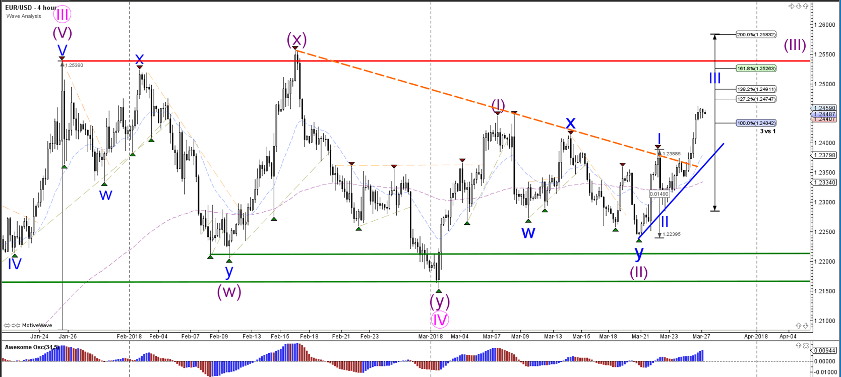 The EUR/USD broke above the resistance trend line (dotted orange). This bullish break seems to have started a potential wave 3 (blue) of 3 (purple).