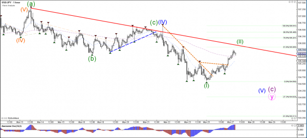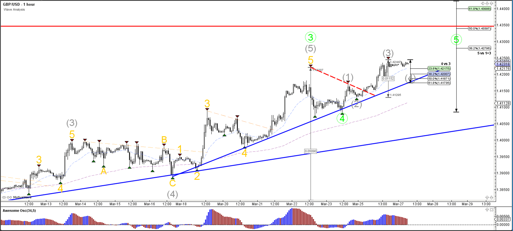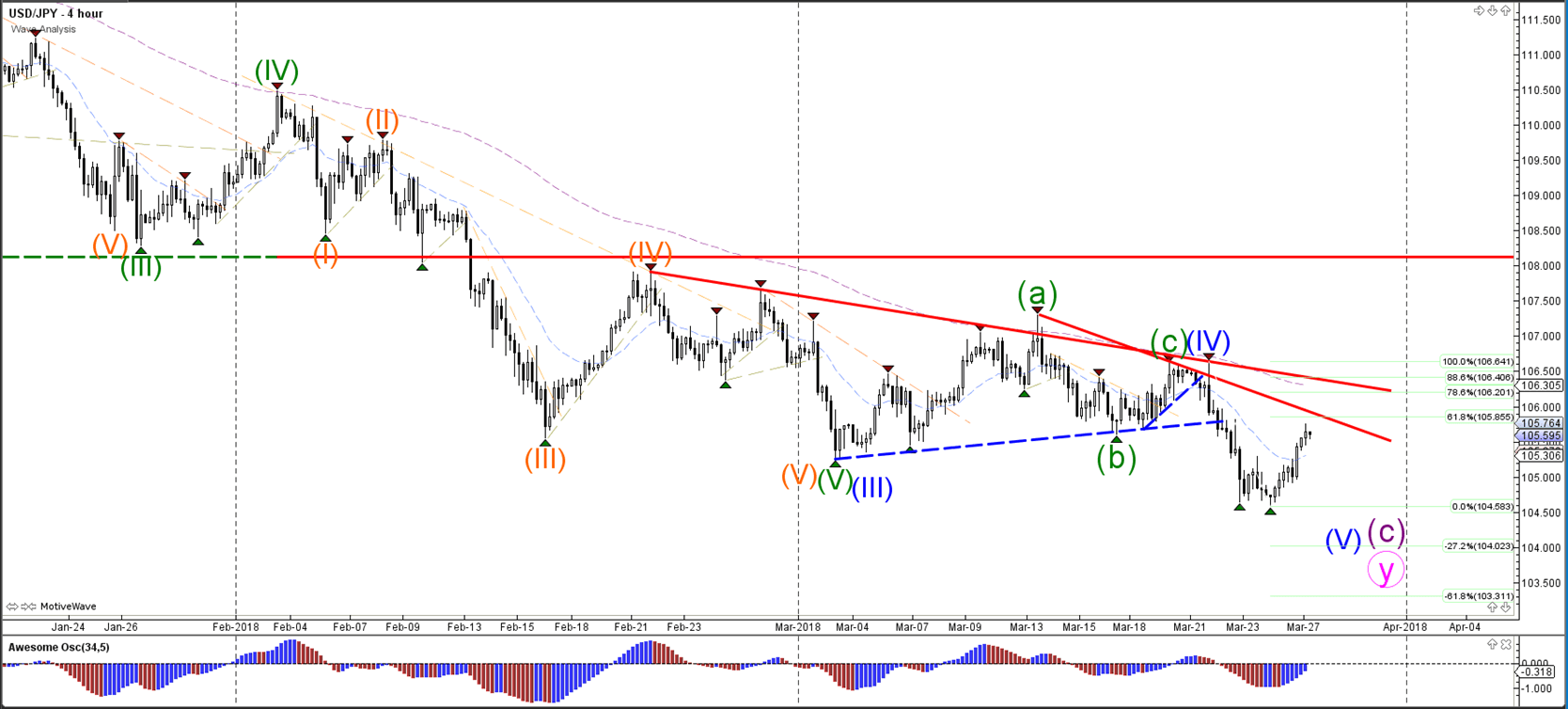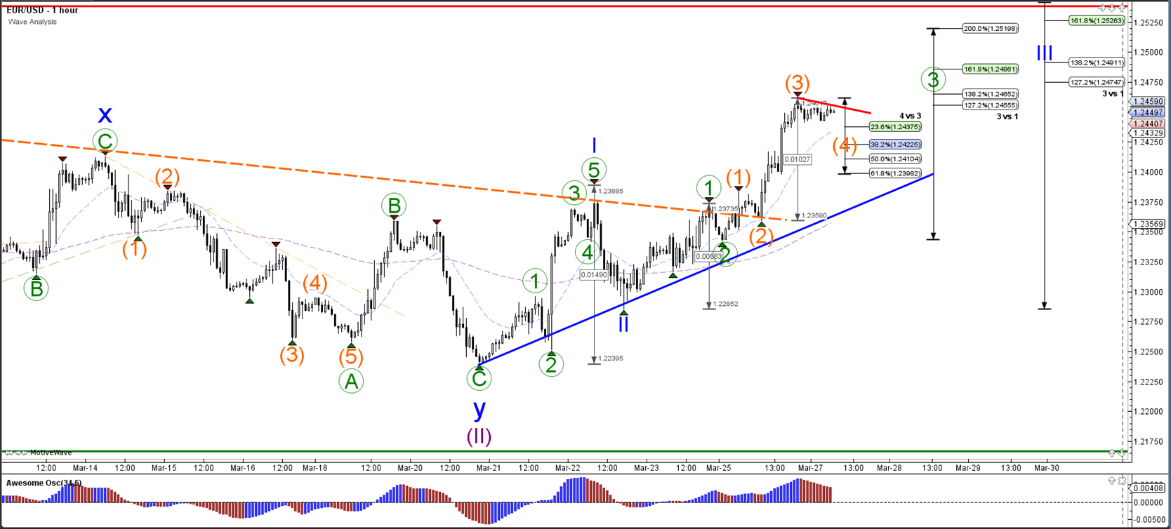 The GBP/USD could be building a wave 4 (grey) retracement. The Fib levels of wave 4 vs 3 could act as support and bouncing levels