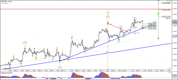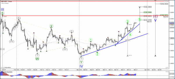 The GBP/USD seems to have completed a wave 4 (green) retracement and is continuing with its strong uptrend. But priceis now approaching the previous top (red), which is an area where price can temporarily pause or reverse.
