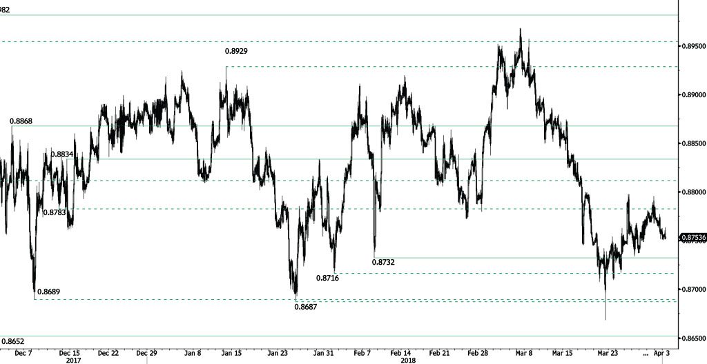 EUR/GBP continues decreasing from 0.8796 high, approaching the 0.8750 range. Bearish pattern started in March is maintained. Hourly support and resistance are maintained at 0.8732 (08/02/2018 low) and 0.8834 (14/12/2017 high). The technical structure suggests short-term decline.