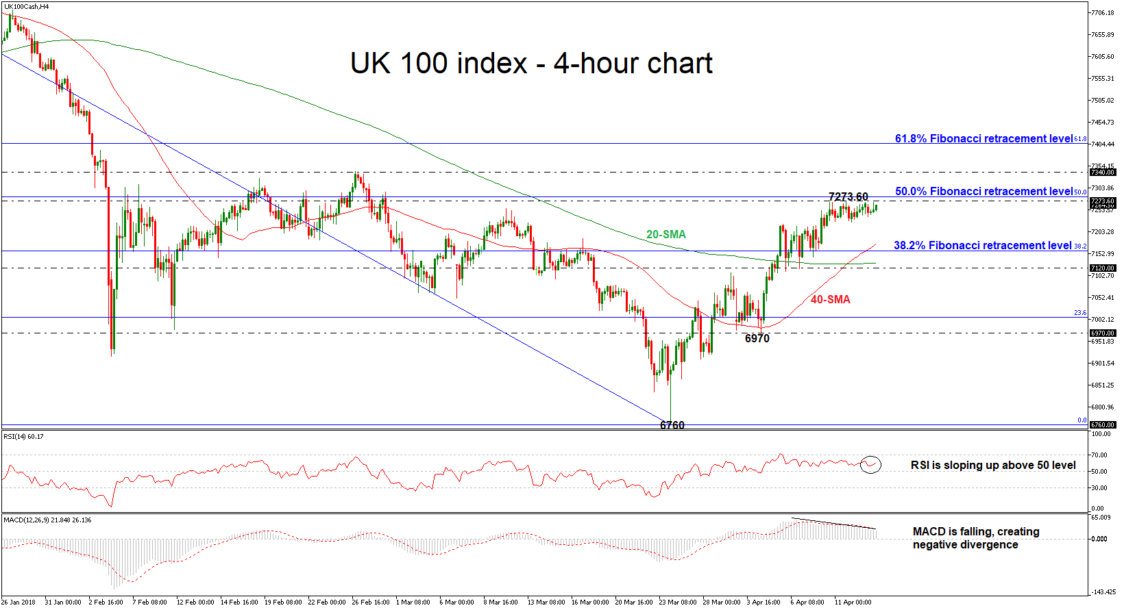 On the flip side, if the bears take back control, the bullish rally may stall initially near the latest highs and turn negative. In such a case, the next immediate support comes from the 38.2% Fibonacci near 7160, which stands near the 40-simple moving average (SMA) in the 4-hour chart. A potential downside violation of this barrier would raise the likelihood of more declines towards 7120 taken from the lows on April 6.