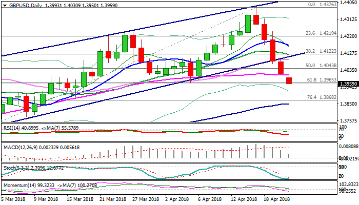 Cable remains in steep descend which extended into fifth straight day and broke below key supports at 1.4000/1.3965 (psychological support / Fibo 61.8% of 1.3711/1.4376 / 05 Apr trough) on fresh bearish acceleration on Monday.