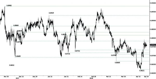 EUR/GBP is increasing following recent sideways trading price action, heading along the 0.8765 range. EUR/GBP bearish pattern started in March is weakened. Hourly support and resistance are given at 0.8668 (22/03/2018 low) and 0.8816 (29/01/2018 high). The technical structure suggests short-term increase.