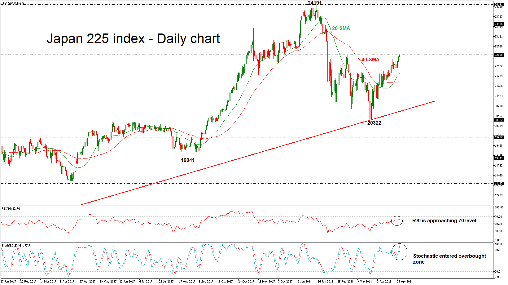 Japan 225 index has advanced considerably since roughly the end of March, hitting a two-month high of 22526 during Friday’s trading. Price action at the moment is taking place not far below this peak. In a longer-timeframe, the index has been developing in an uptrend since June 2016 and this week it surpassed the 20-week simple moving average.